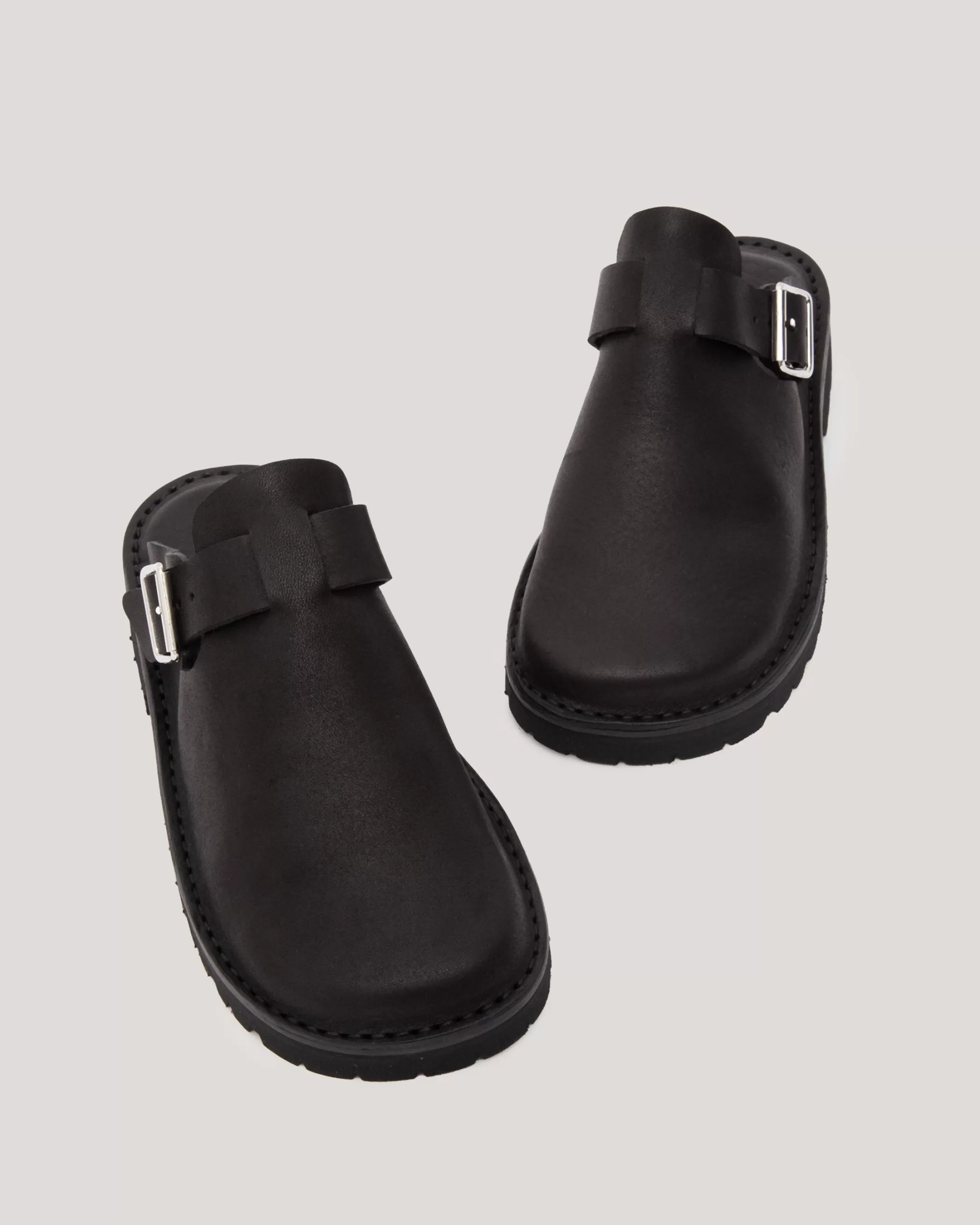 Fracap x YMC leather mulesMetallic buckle fasteningContrast welt stitchingOpen …